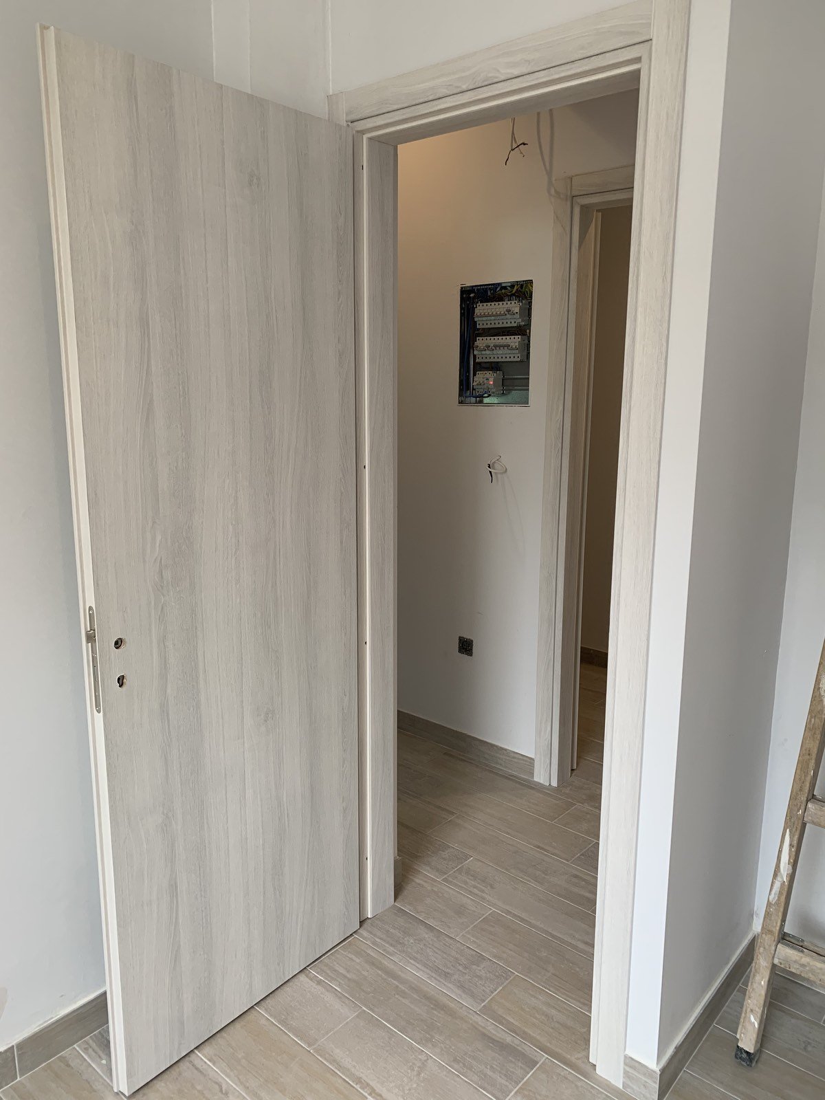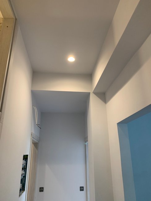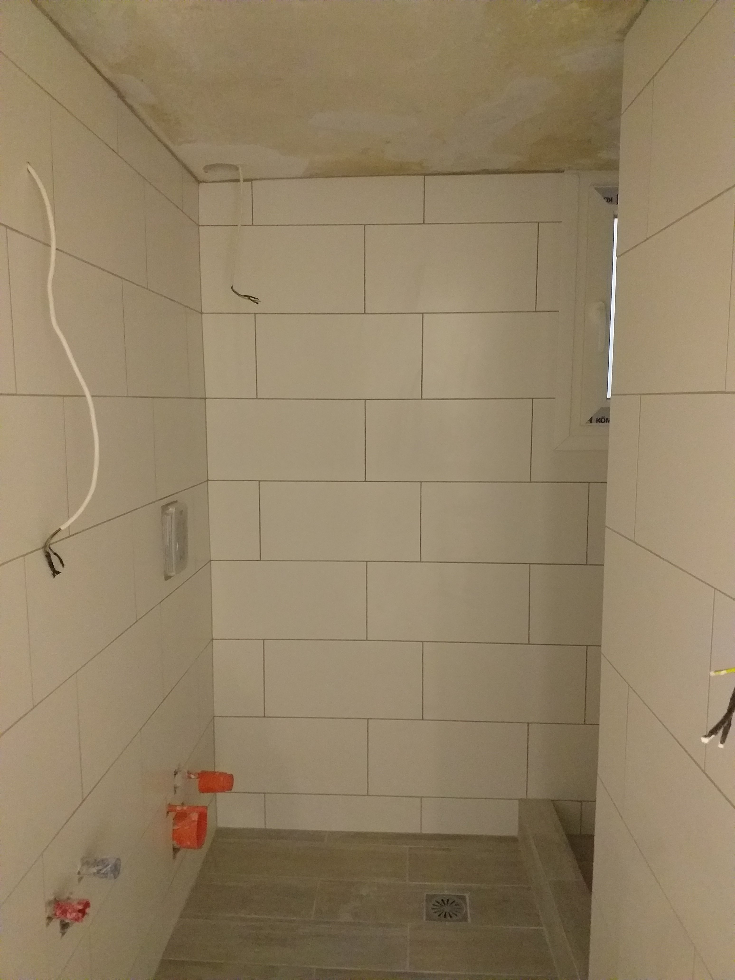 The balcony door is in place in the new kitchen. The little balcony is being tiled with the same tiles as inside.TIles on the bathroom walls and a new smaller window.New back door and window in the small room that used to be the kitchen. Where the window is now used to be glass bricks to let in light. Now we can get air in as well!The window in the main bedroom isn’t in yet cause the window guys broke it… We await a replacement…I’ve gone with the same floor tiles throughout the house.Spots embedded in the lowered ceiling.All new doors and frames. I didn’t pick the doors… hm… I’d have gone with all white. There will be a new door on the storage space above the bathroom. That’s where the hot water cylinder normally sits but we no longer need one in there as we are connecting to natural gas.