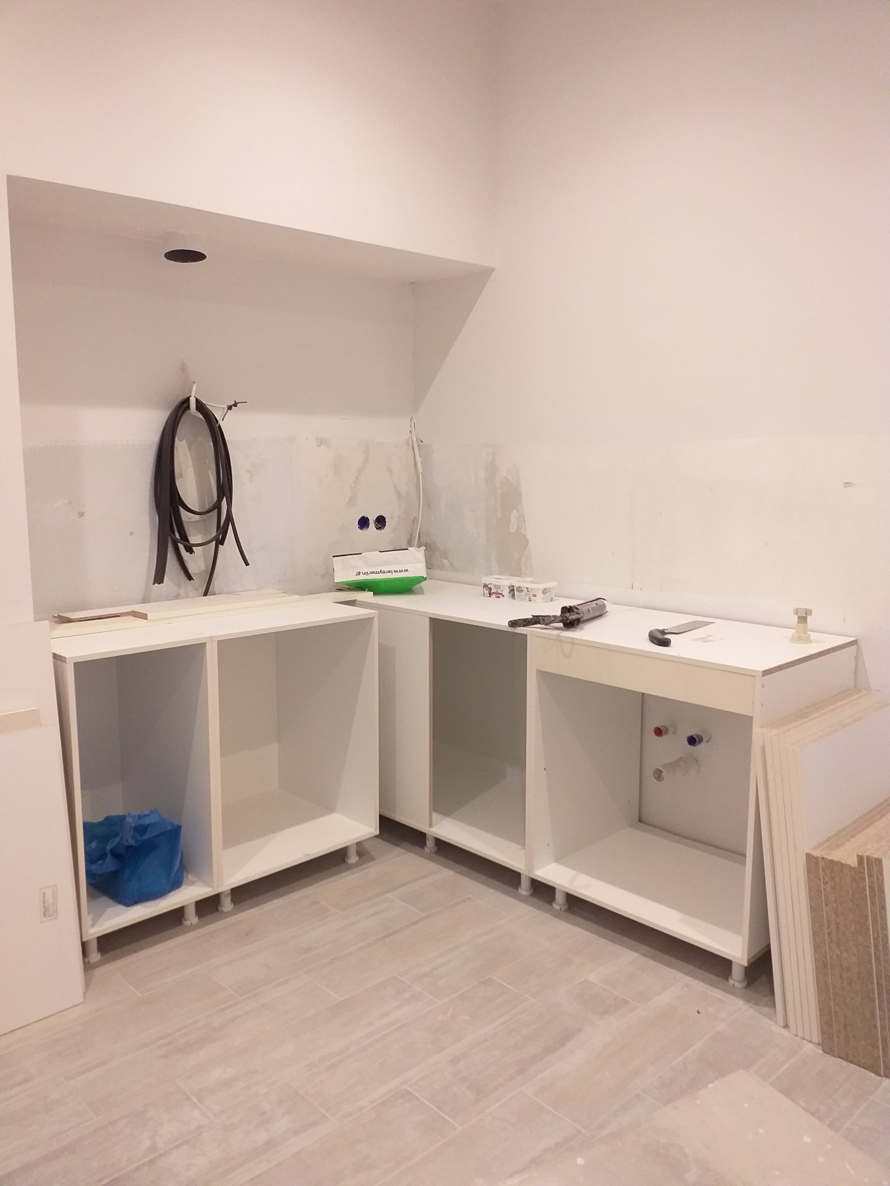 HOPEFULLY the plumber will be here this morning to put through the natural gas pipe BEFORE the kitchen cabinets need to go in. He was meant to come yesterday…