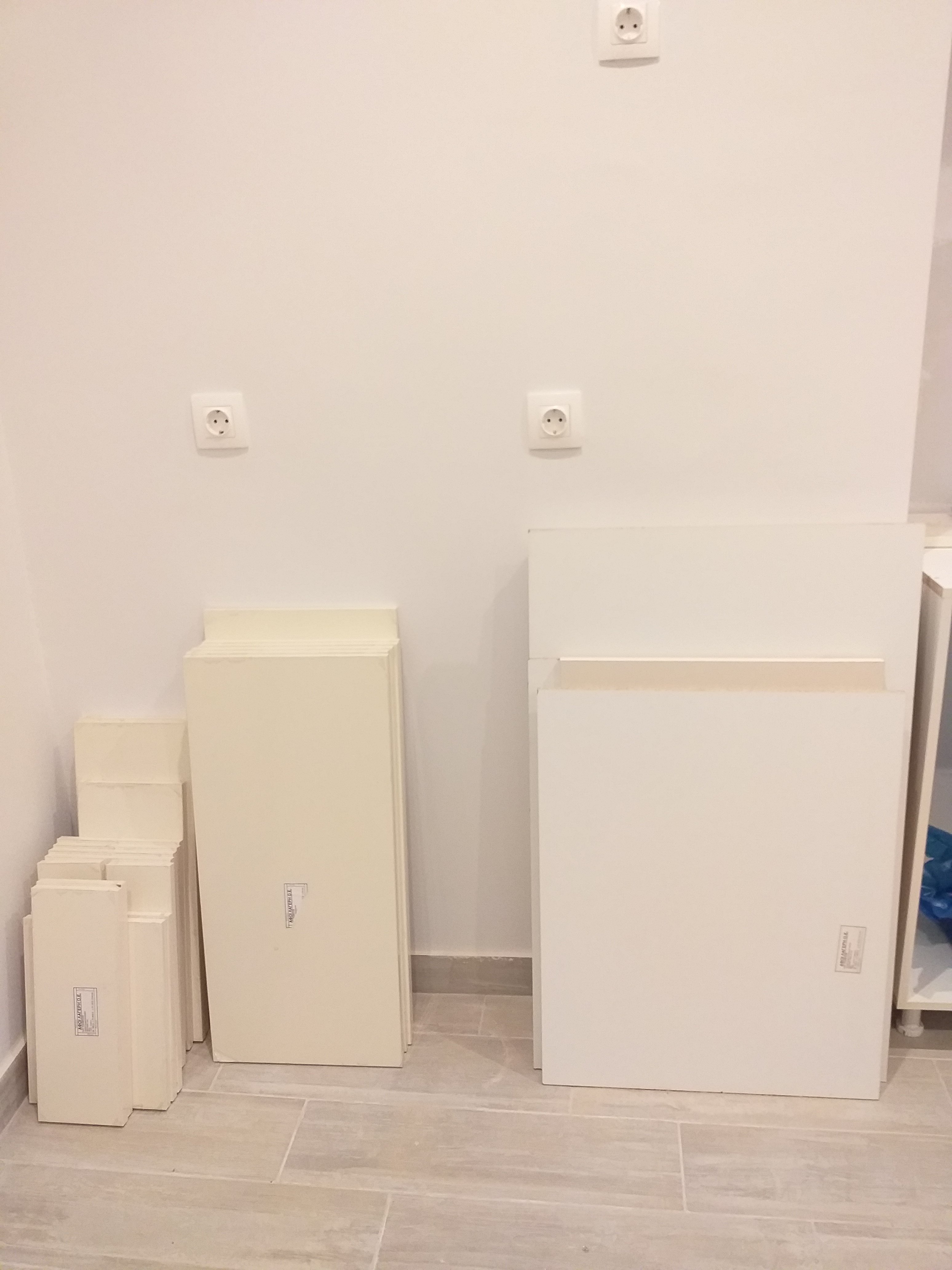 The living room is storage for all the wardrobe bits.The huge wardrobe in the tiny bedroom.Kitchen cabinets will be put in today once the wardrobes are finished.A couple of cabinets in position.The colour of the kitchen cabinets on the left.The wardrobe in the main bedroom is coming together.The bathroom is still an empty shell.