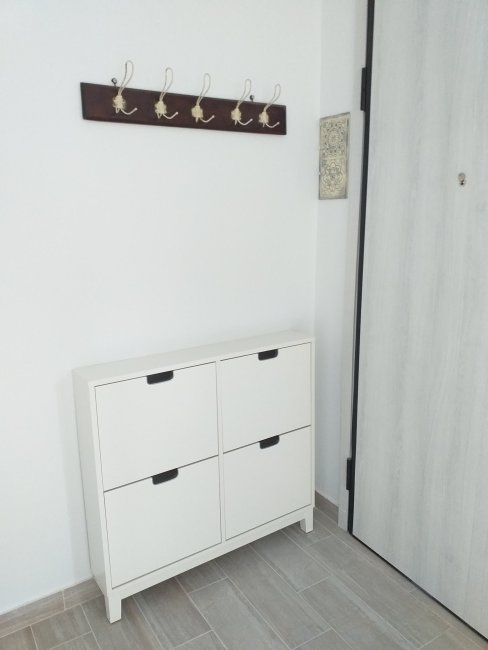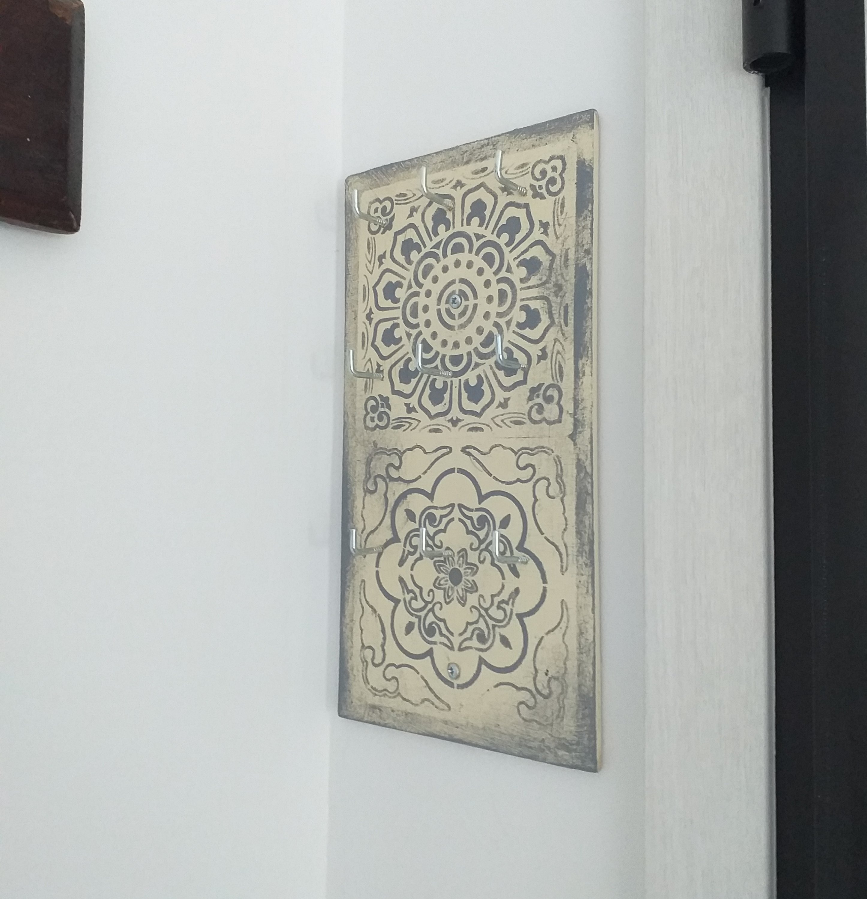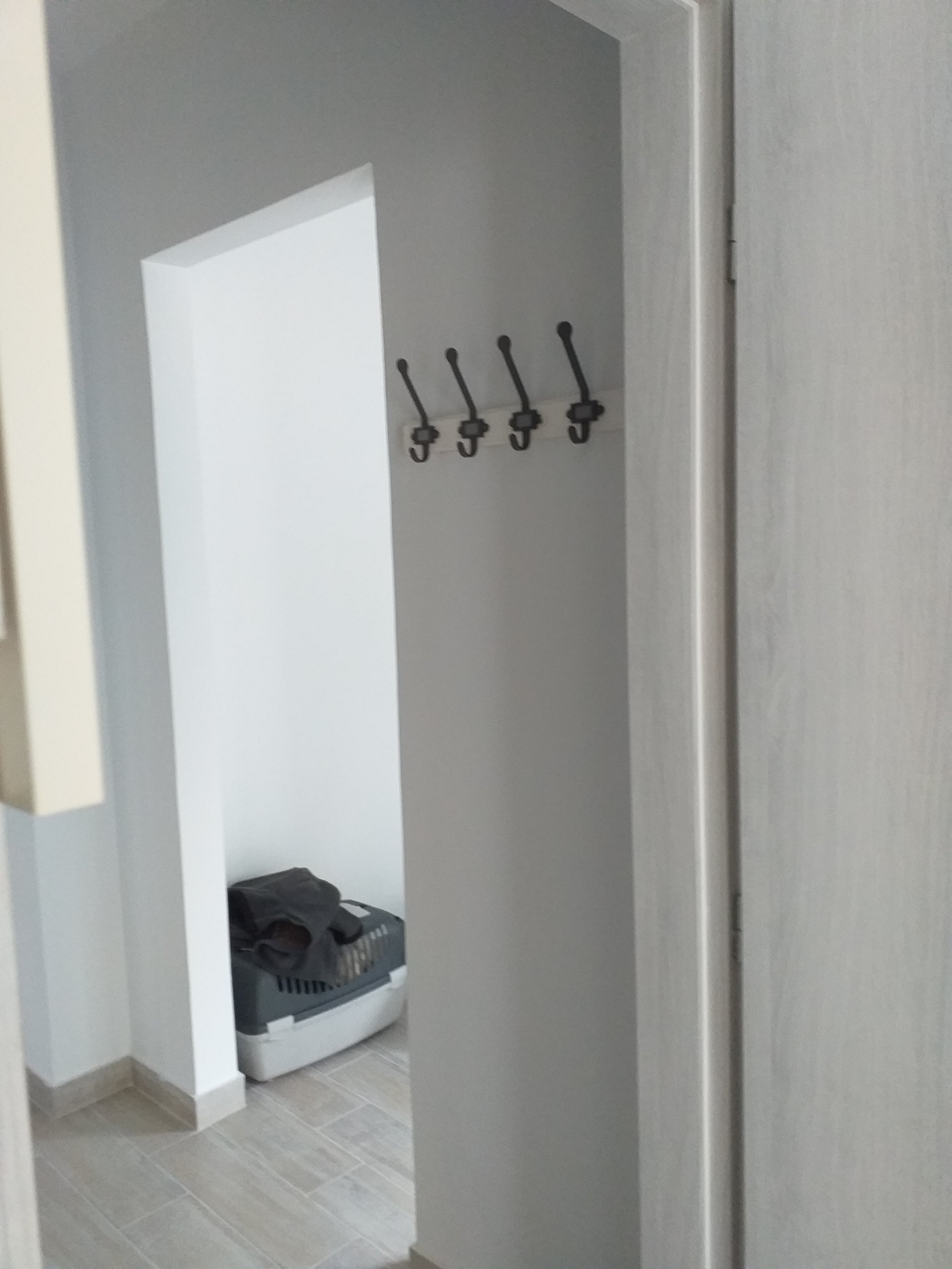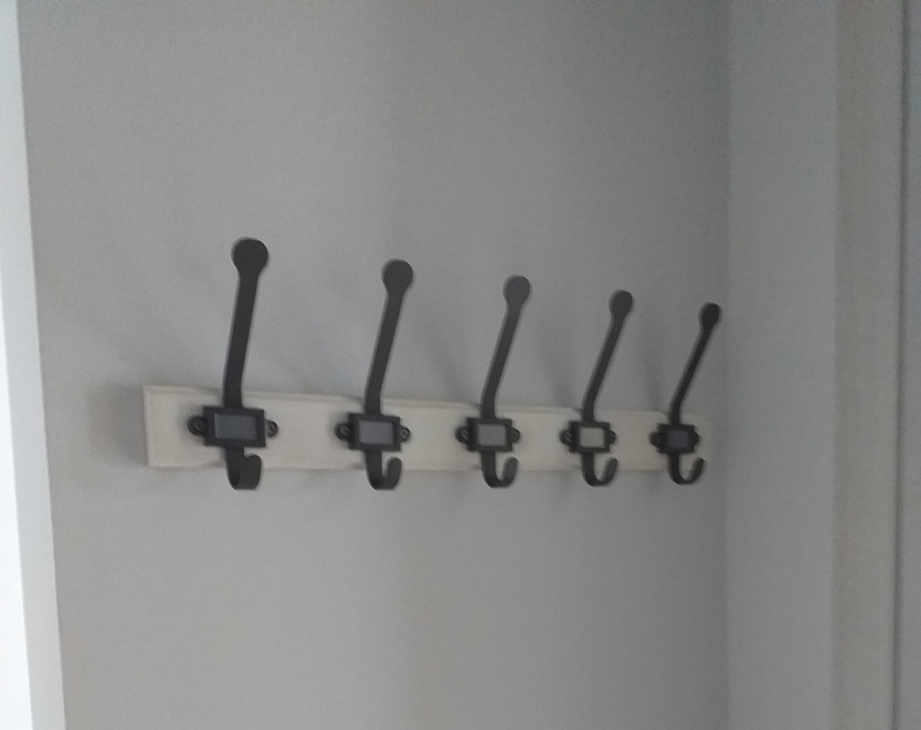 I attached the Ikea shoe storage unit to the wall behind the front door and put in the drawers so thats finished. I hung my grandmother’s old coat rack on the wall above, and the small key rack I made in the corner.