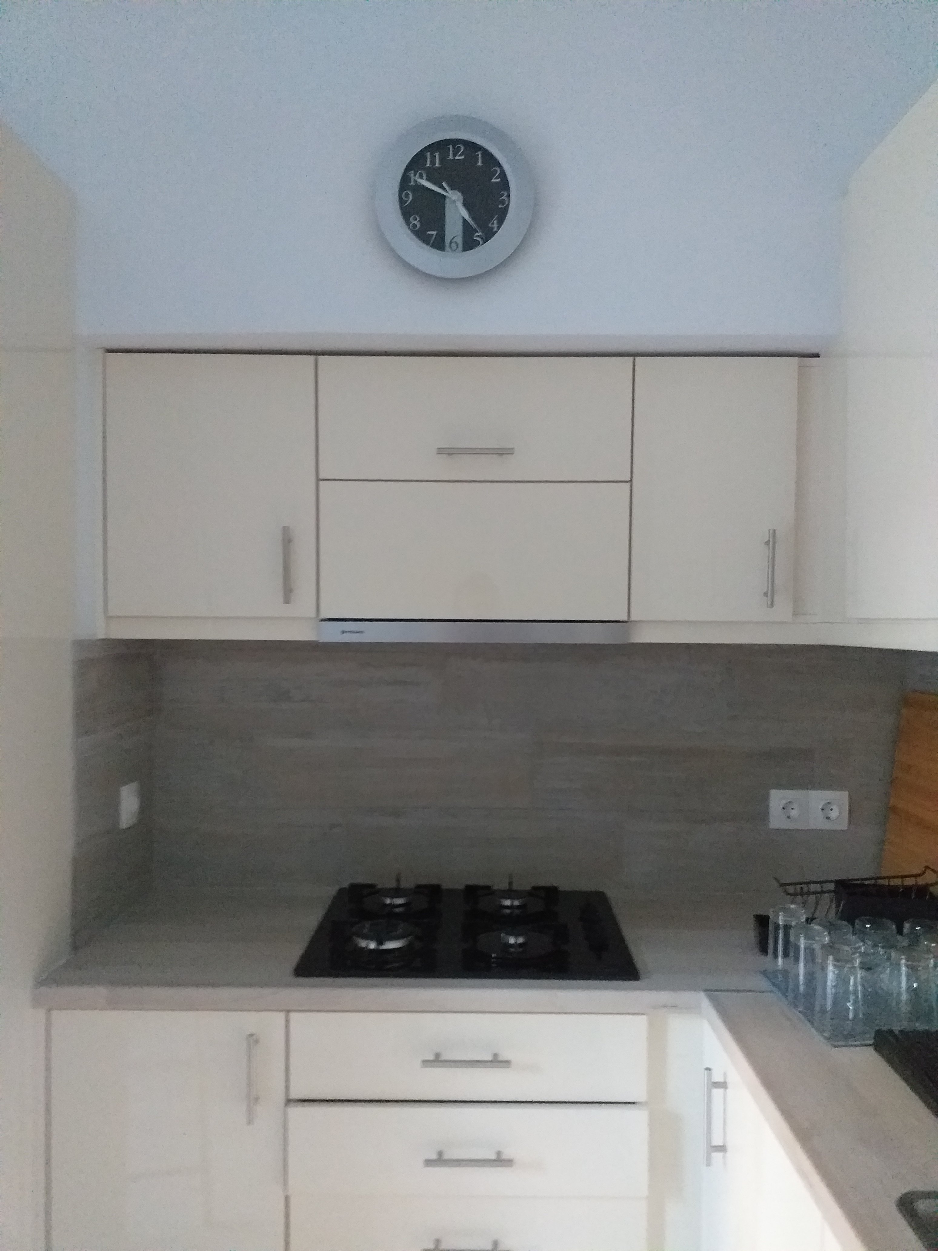 The gas cooktop I ordered should be delivered tomorrow. Long story – there was a mix up and they delivered it to Paros so mom has sent it back… my mix up. Oops. The benchtop can be cut once we have that. We already have the sink.