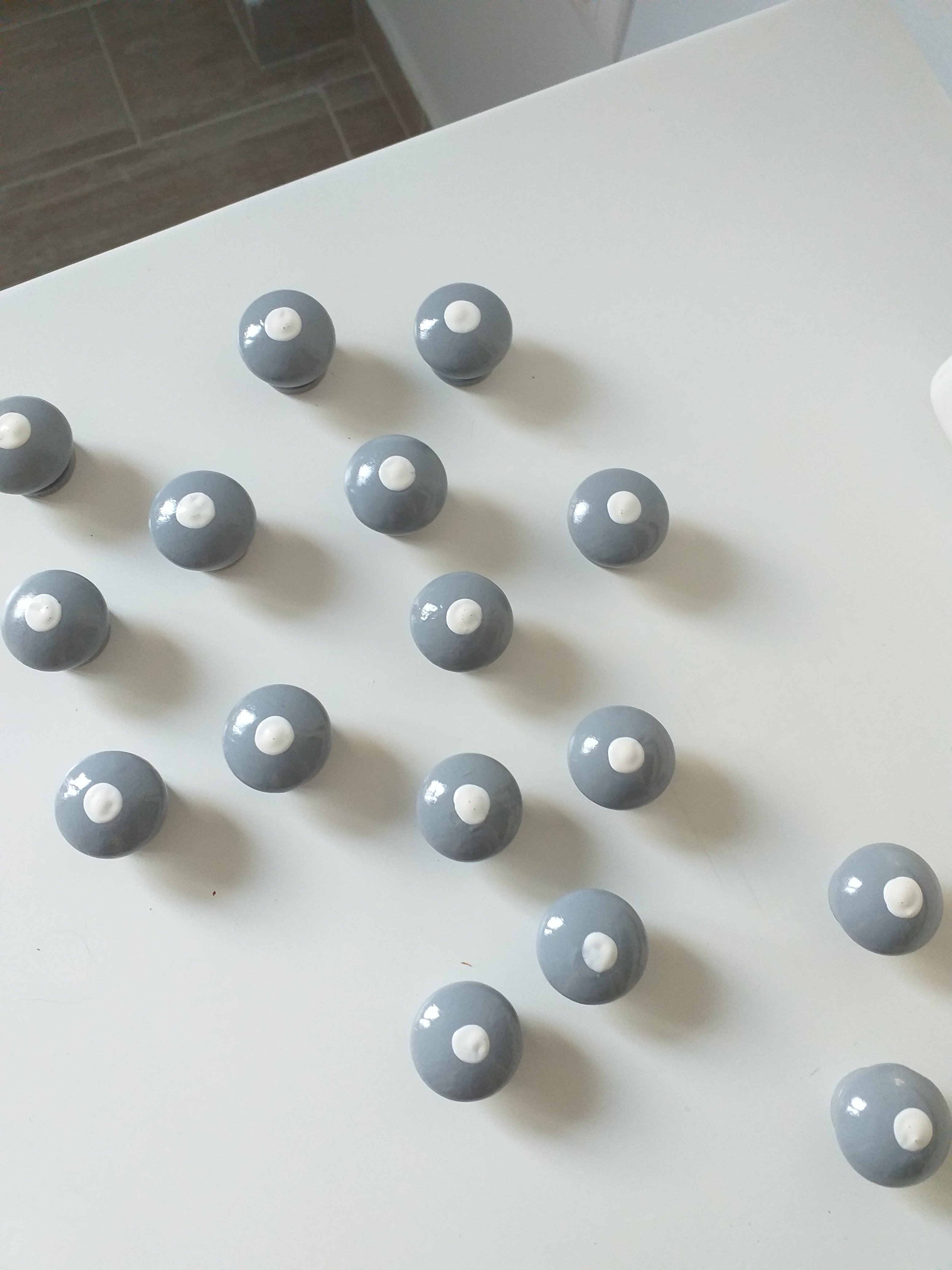 I gave them all a dot of white paint and voila. Cute knobs instead of ooops knobs.