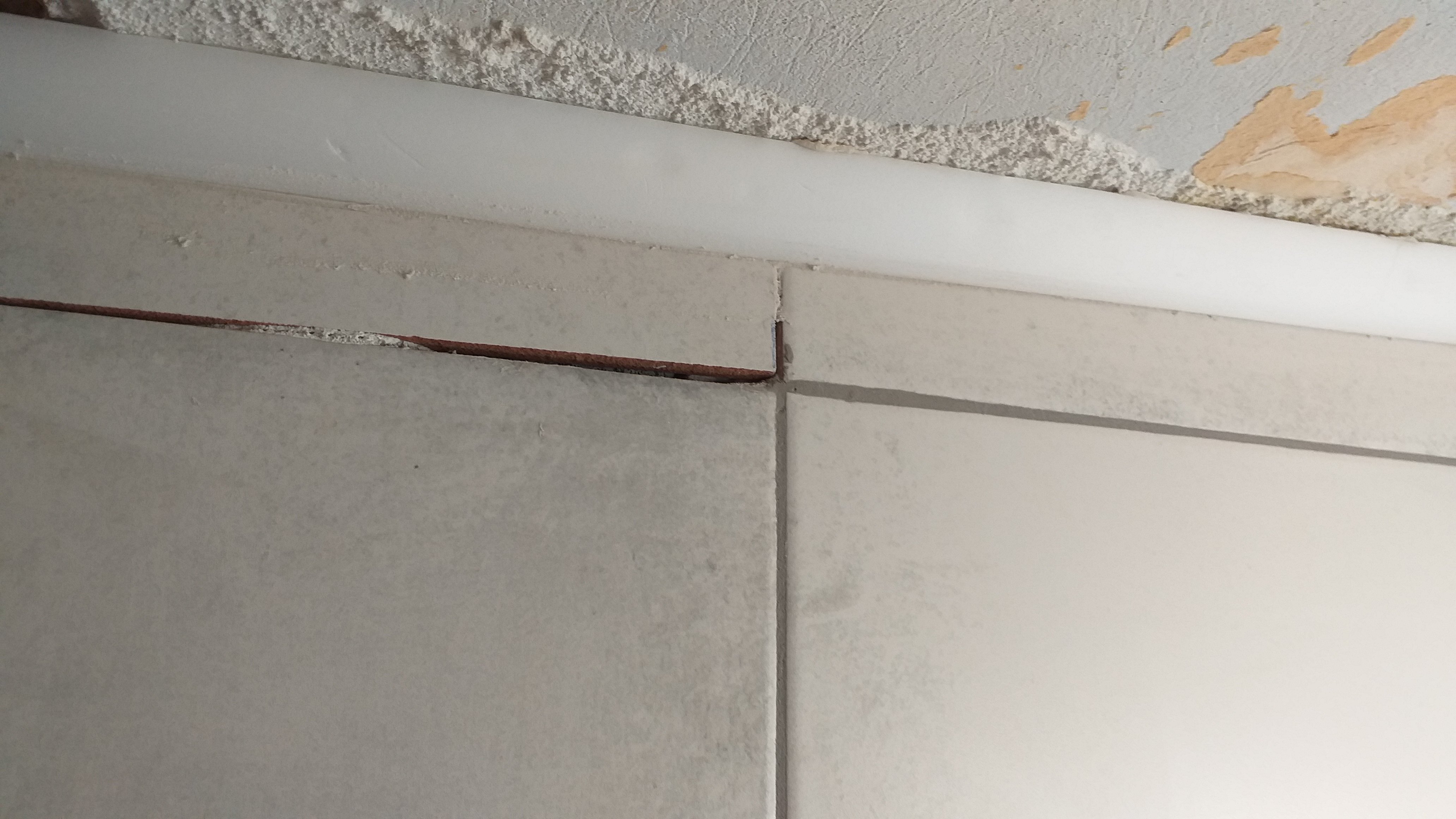Put in skirting boards on that wall, quad in the corners and trims around door