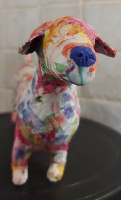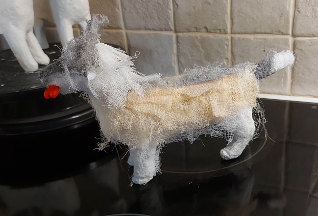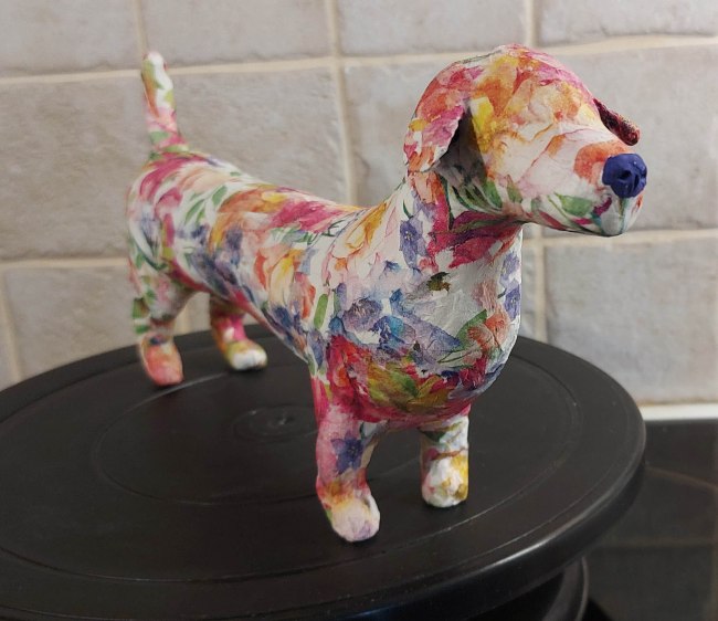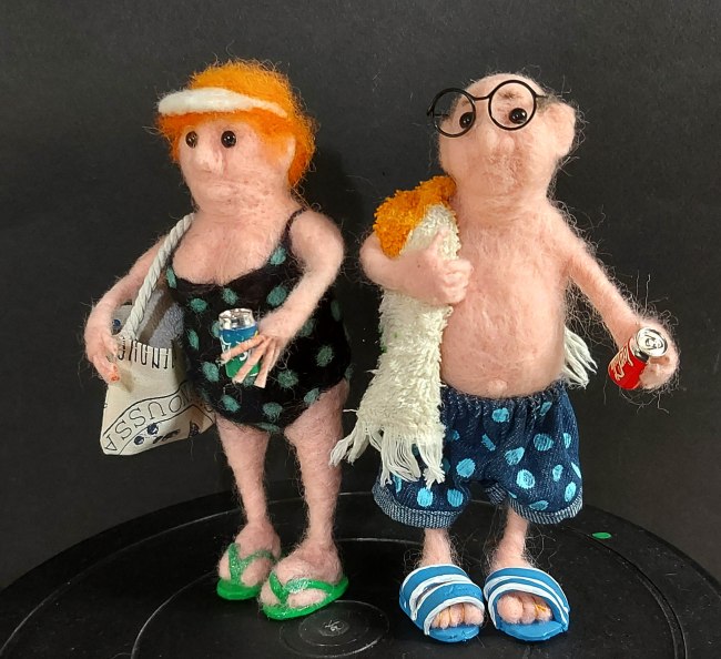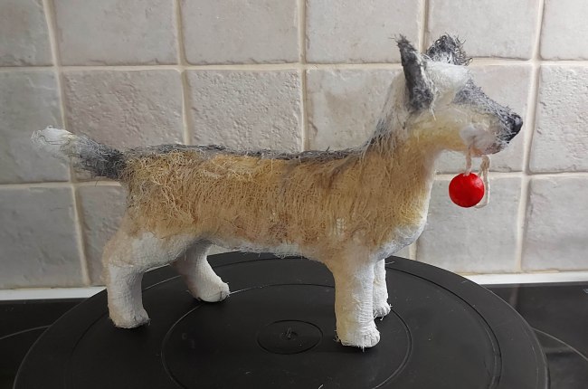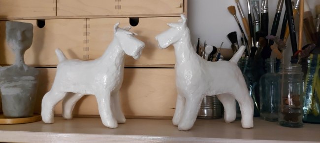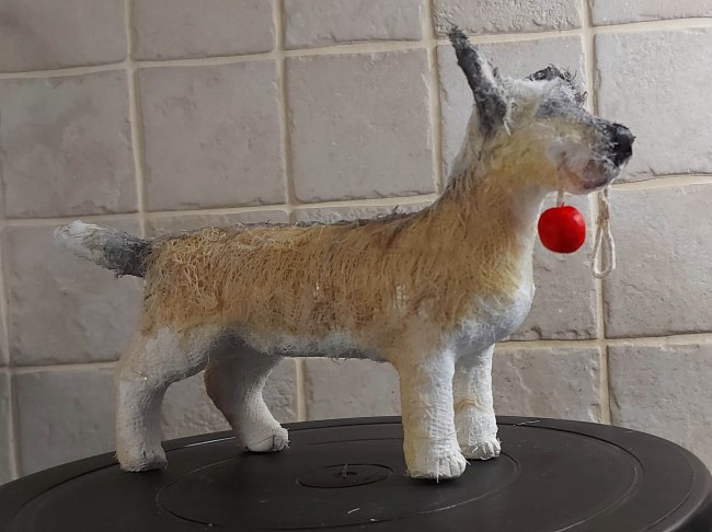 These little guys are so much fun to make. They’re done in a couple of days mostly, depending on the time I have to spend on them and the bits I need to make – like the shoes and any props I can’t buy. Sometimes I make my own clothes (like Elvis’ jacket and the aprons on the cook and gardener), or footwear which means I have to let the air dry clay I use in most cases dry. And any painting I need to do… But they’re quicker to make than the papier mâché dogs I had been making in the past. Not to say I won’t be making more of those!
