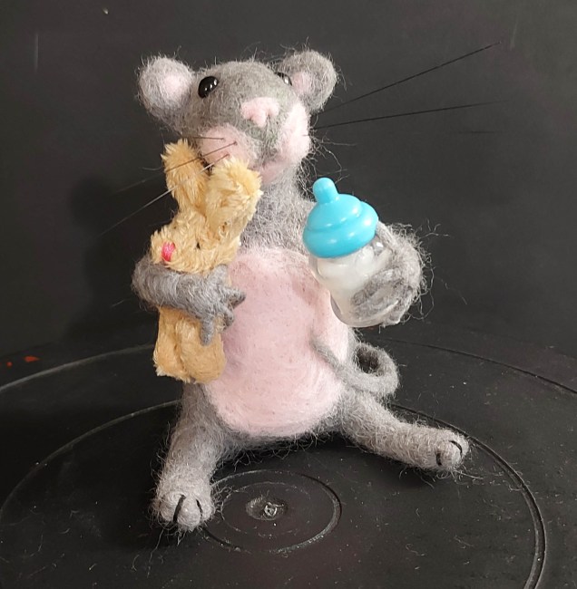 Here is baby boy mouse with his bunny and milk bottle.