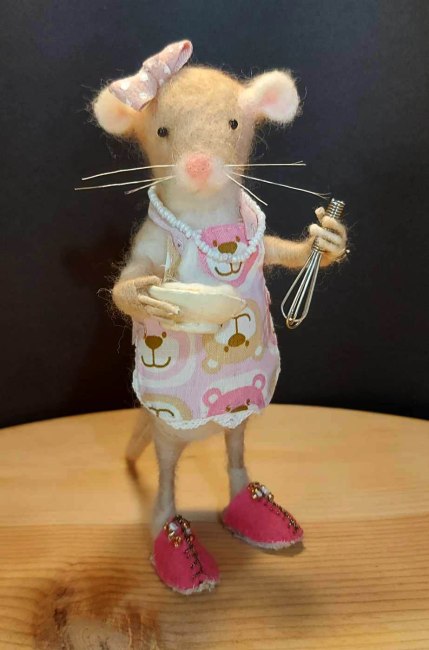 A ladylike mouse whipping up cream to top a pie.