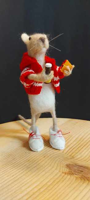 A homeboy mouse with a hoodie, untied sneakers and snacks.
