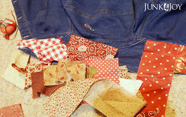 Step 2: Select fabrics that compliment eachother in colours you like. I chose different red tones and patterns.