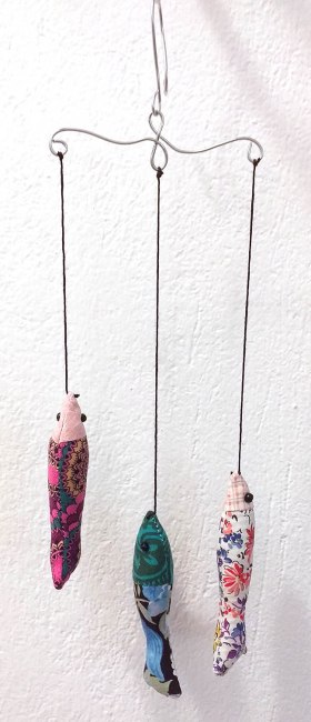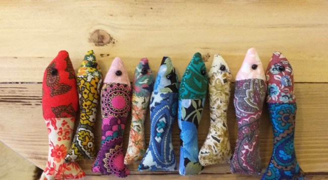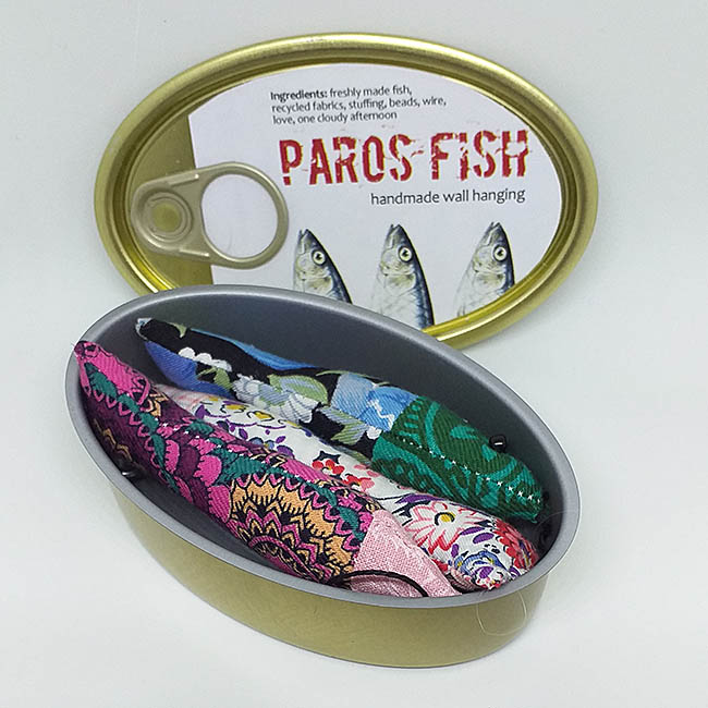 A long time ago I’d bought these little tin cans in Athens thinking I’d like to make fabric sardines to go in them. So while I was in sewing mood one day I some small fabric scrap fish.