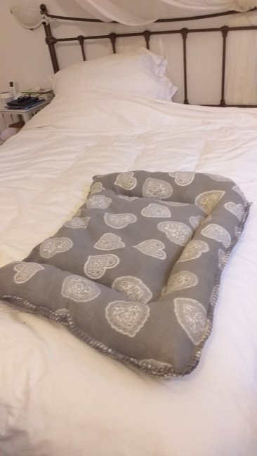 I made a new bed for Lainee. I’d made her one out of a fluffy sweater last year*, which she loved, but I thought it was time to upgrade. I found that the best (and cheapest) way to make dog beds is to buy cheap throws and recylcing old pillow stuffing. It might be yuck for us, but for the dog its a bonus if it smells like us! And buying the fabric costs way more than the cheap throws. Go figure.