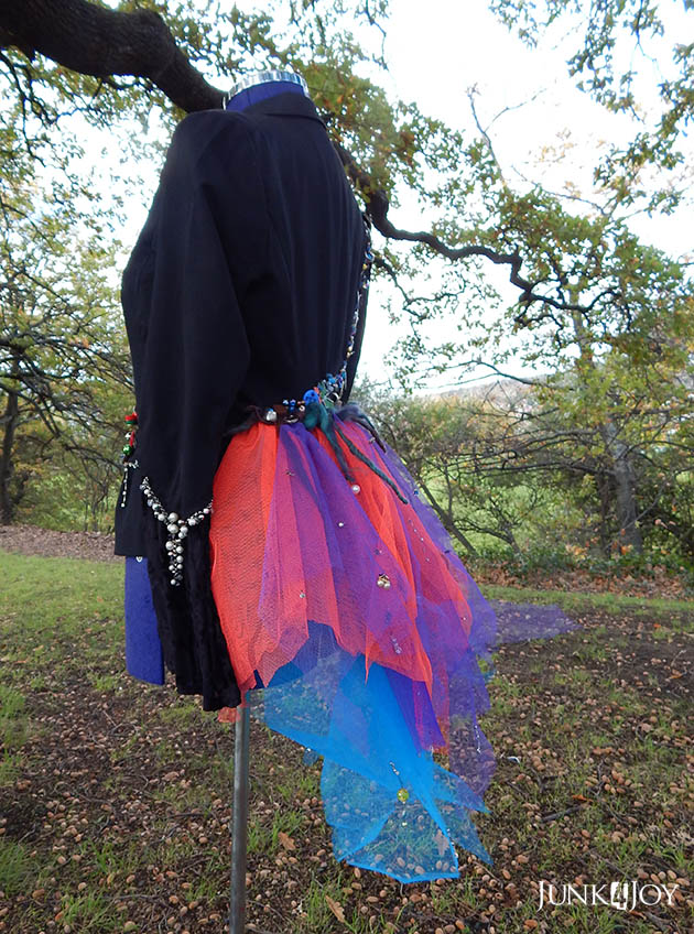 The tall one that looks black in the photos is actually a very dark blue. It began life as a tall metal lamp base which was covered in toy animals using liquid nails, then sprayed what we thought was bright orange. Unfortunately the orange sucked big time, so we tried a couple of other colours, ending up with dark blue for the best coverage.