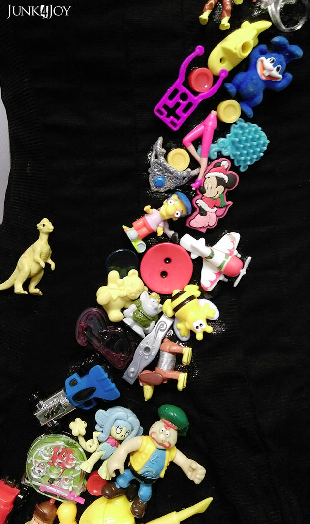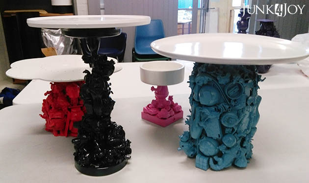 These kids party cake stands were made in my Thursday group. We spent time collecting, begging, stealing and borrowing old/broken toys from anywhere we could find them. I spent ages asking for things on FB and at work via our newsletter and noticeboards.