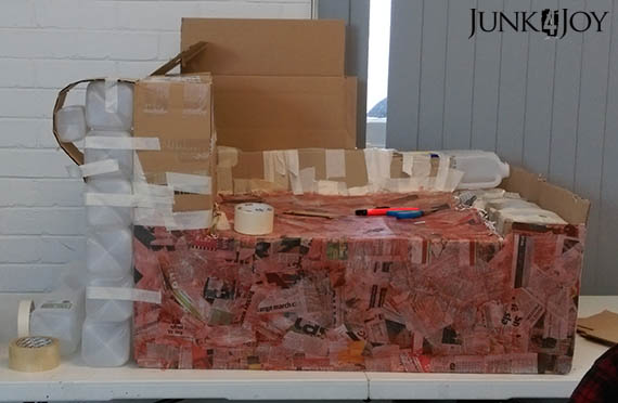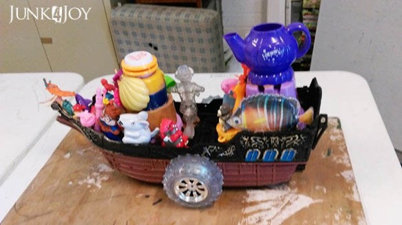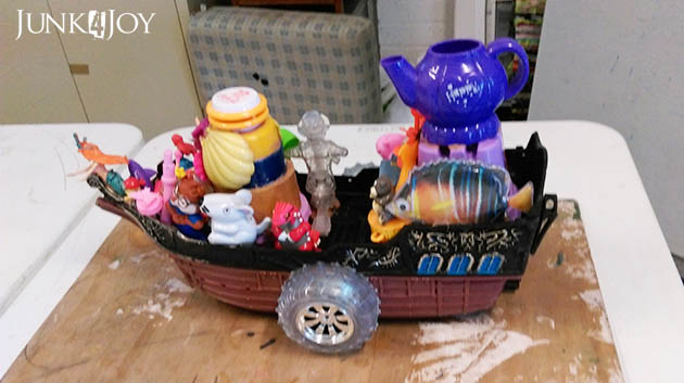 This one is my all time favourite. Its made out of a pirate ship, tea pots and all kinds of ‘human’ and animal figures plus anything ‘fishy’ we could find.. Oh and the wheels off a toy truck.