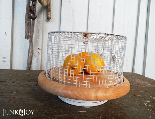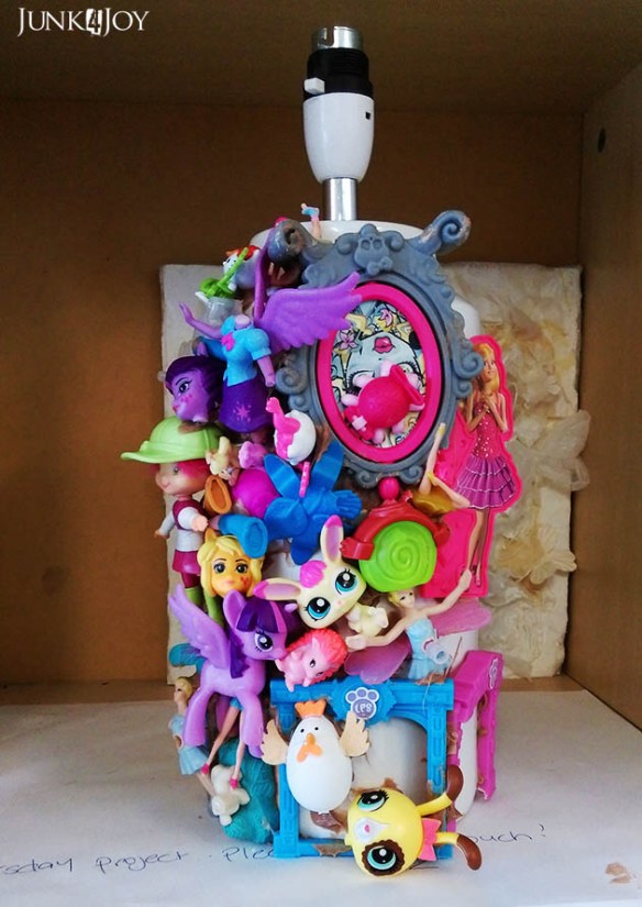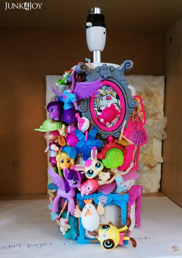 For the top we used different flat items as bases – anything from old cds to small wooden dishes. These were glued to the light globe holder on the lamp base and provided a nice big surface to glue the platters to.