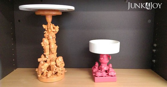 Here are the four drying in their first coats of paint. The smallest one with the bowl on top is more like a bowl for M&Ms or other lollies than a cake platter. Its made of a basically flat square base that a light globe fits onto without a shade. We used a snoopy body as the ‘stand’ and surrounded it with Peanuts characters in cars. The top is a wooden bowl I had lying around.