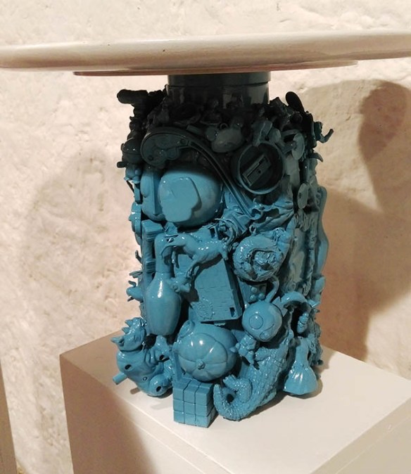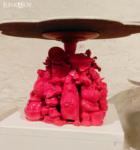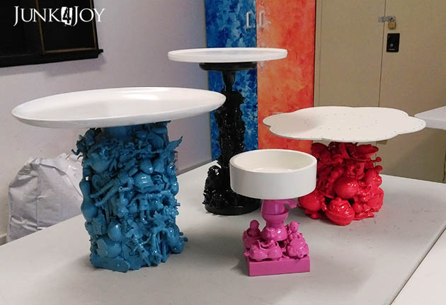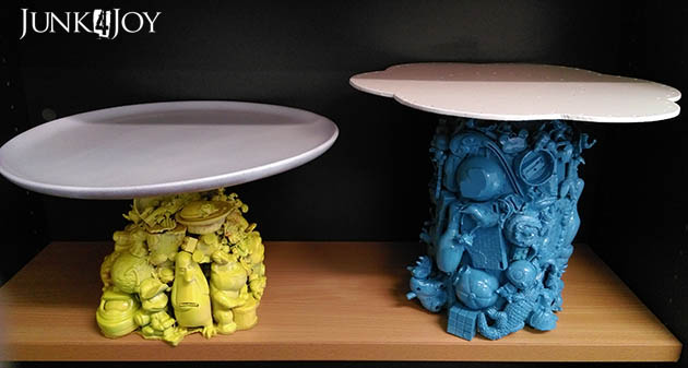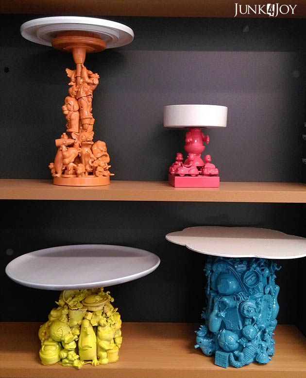 The light blue one was made using a large ceramic lamp base, covered in random toys and topped with a large wooden platter.