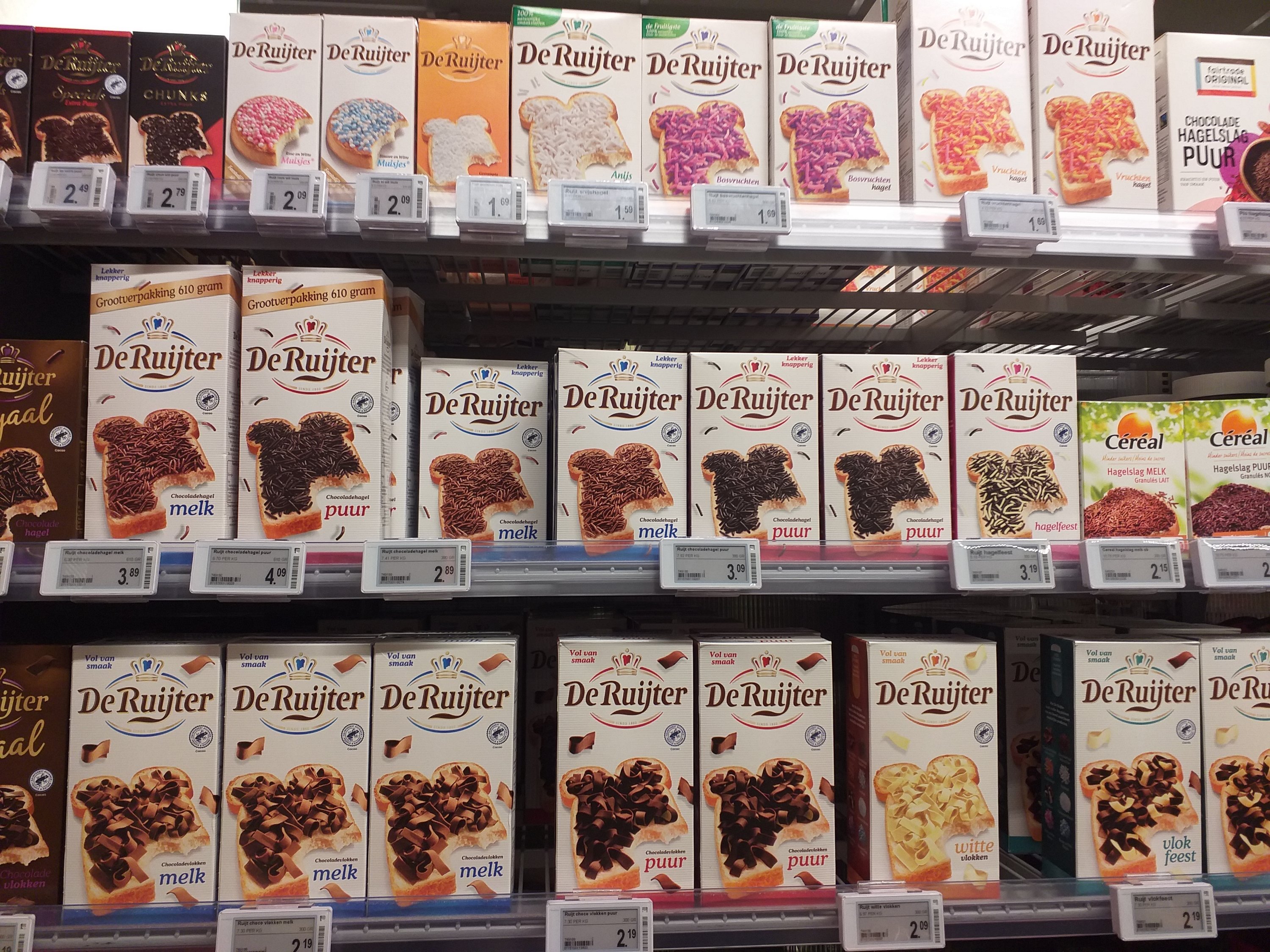 Then there’s the hagelslag section… I’ve never seen anything like this anywhere else. Chocolate and candy sprinkles to put on your bread! I mean, I grew up in Australia where a staple of children’s parties was fairy bread (for those that don’t know it, its Hundreds and Thousands on buttered white bread, back when it was ok to feed children candy, white bread and butter!), but here it seems not only children eat chocolate shavings or sprinkles on their bread. First time I had it was when visiting a friend in Amsterdam when we were 20yrs old or so…
