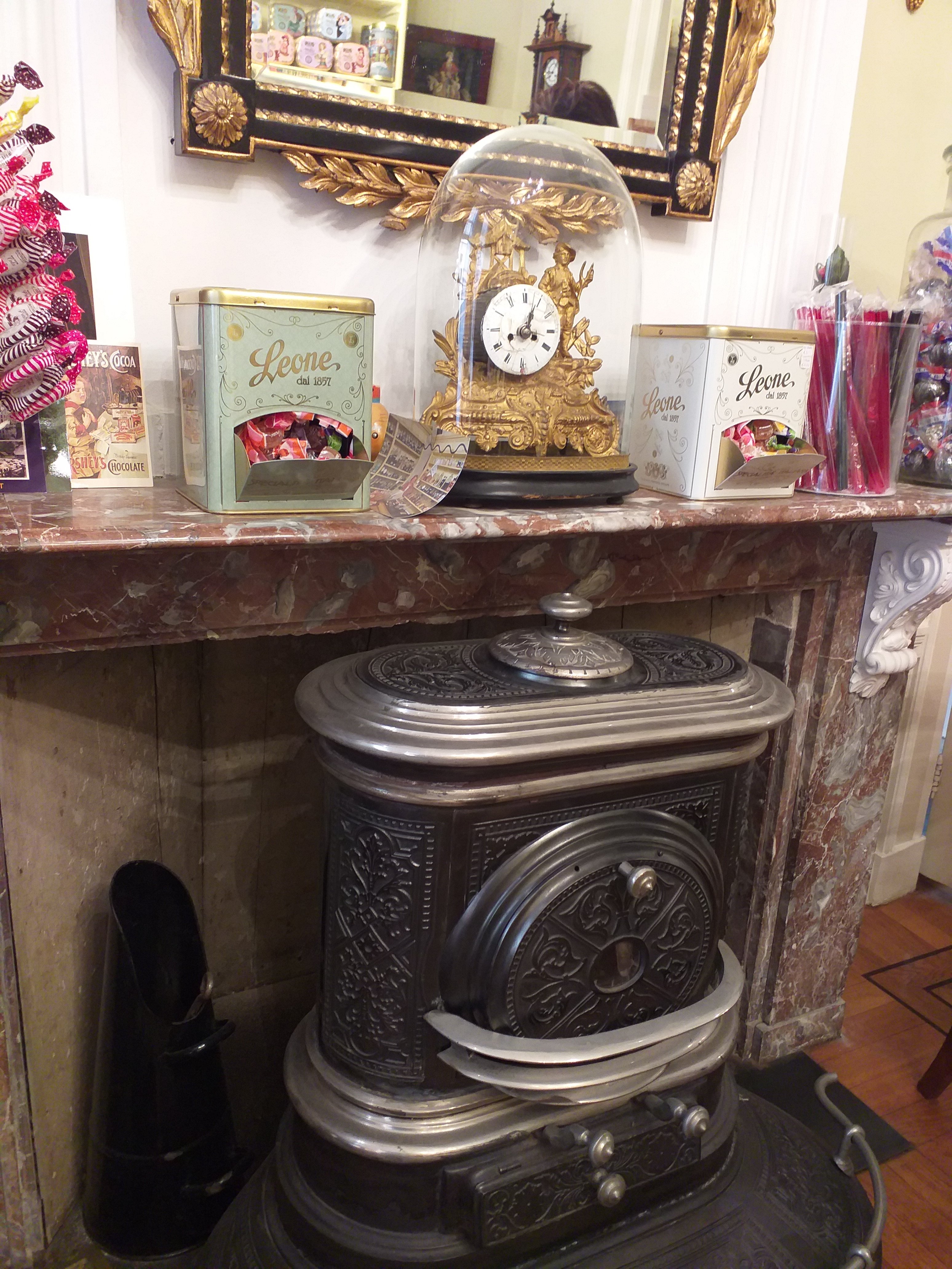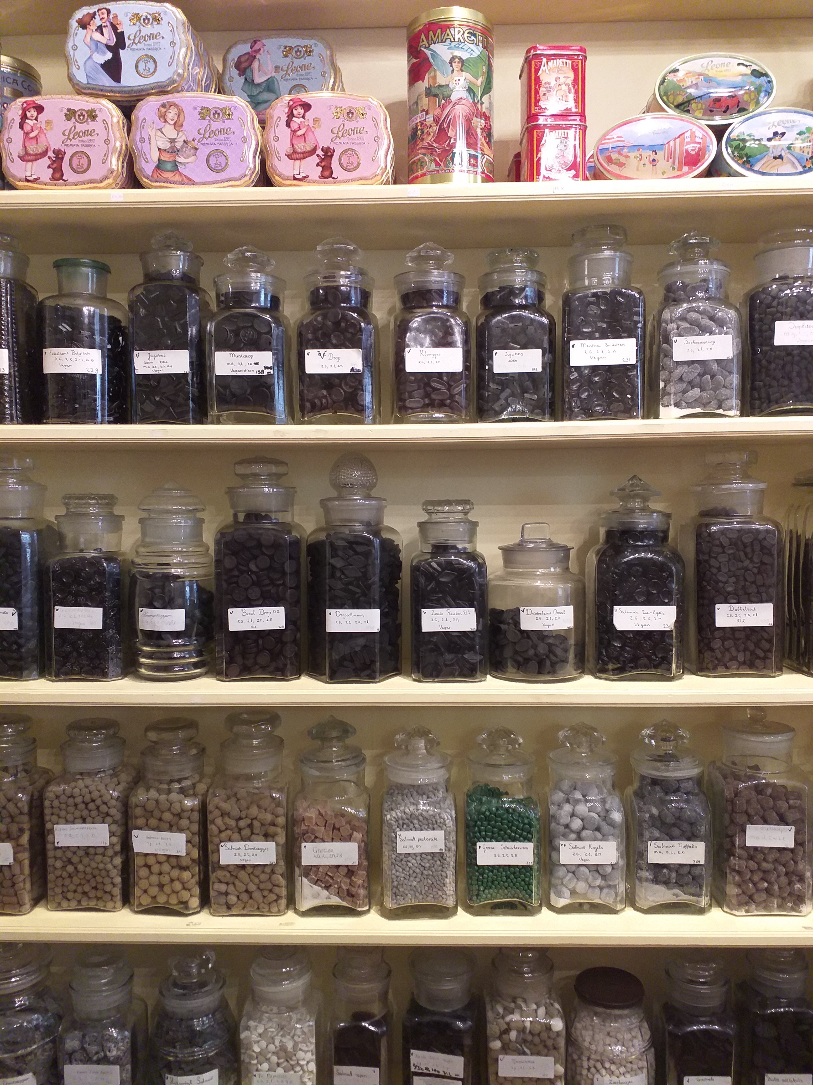 The many many types of ‘drop’.The paper cones hanging from above, ready to be filled with candy.Making use of old tins.
