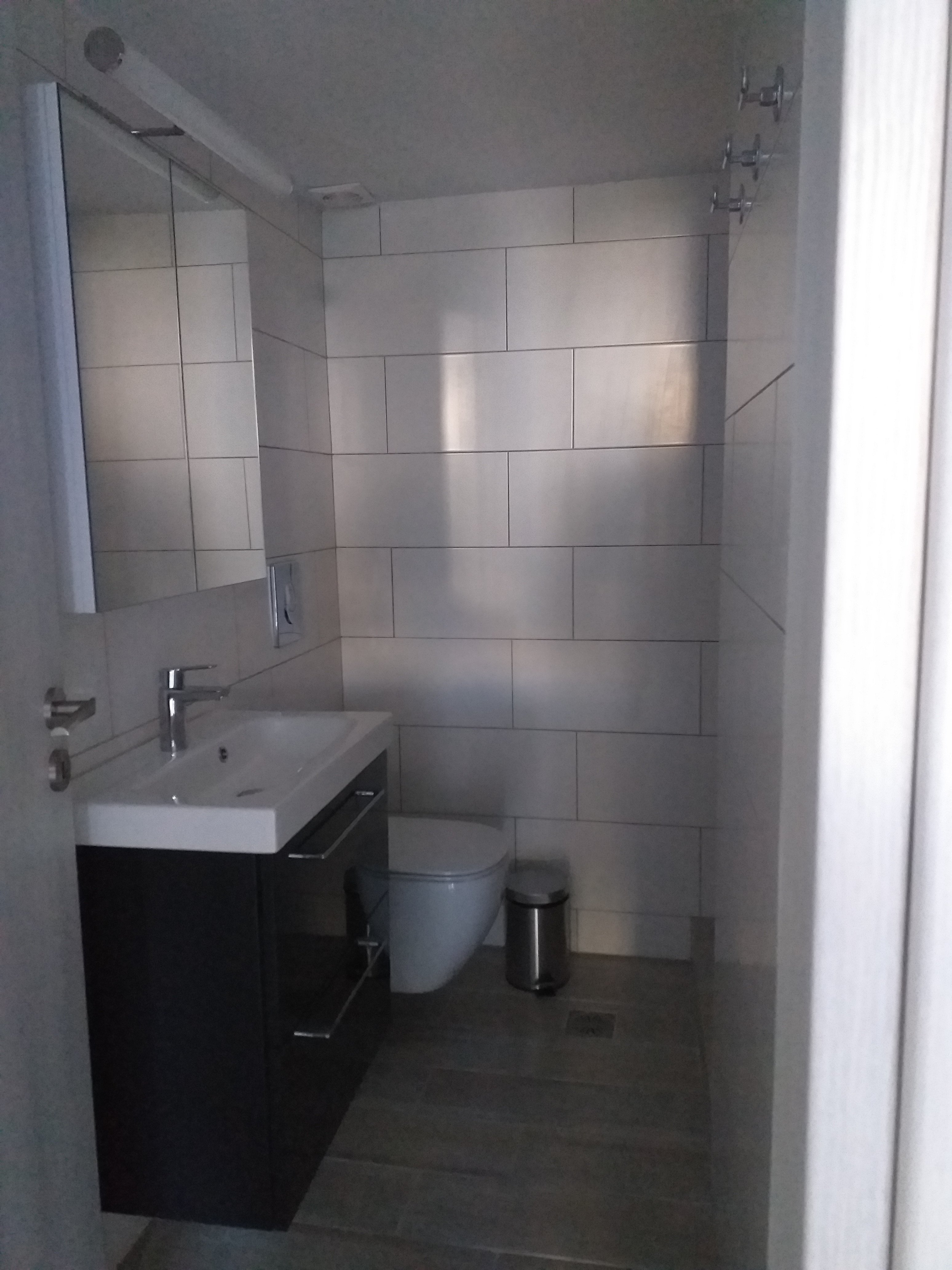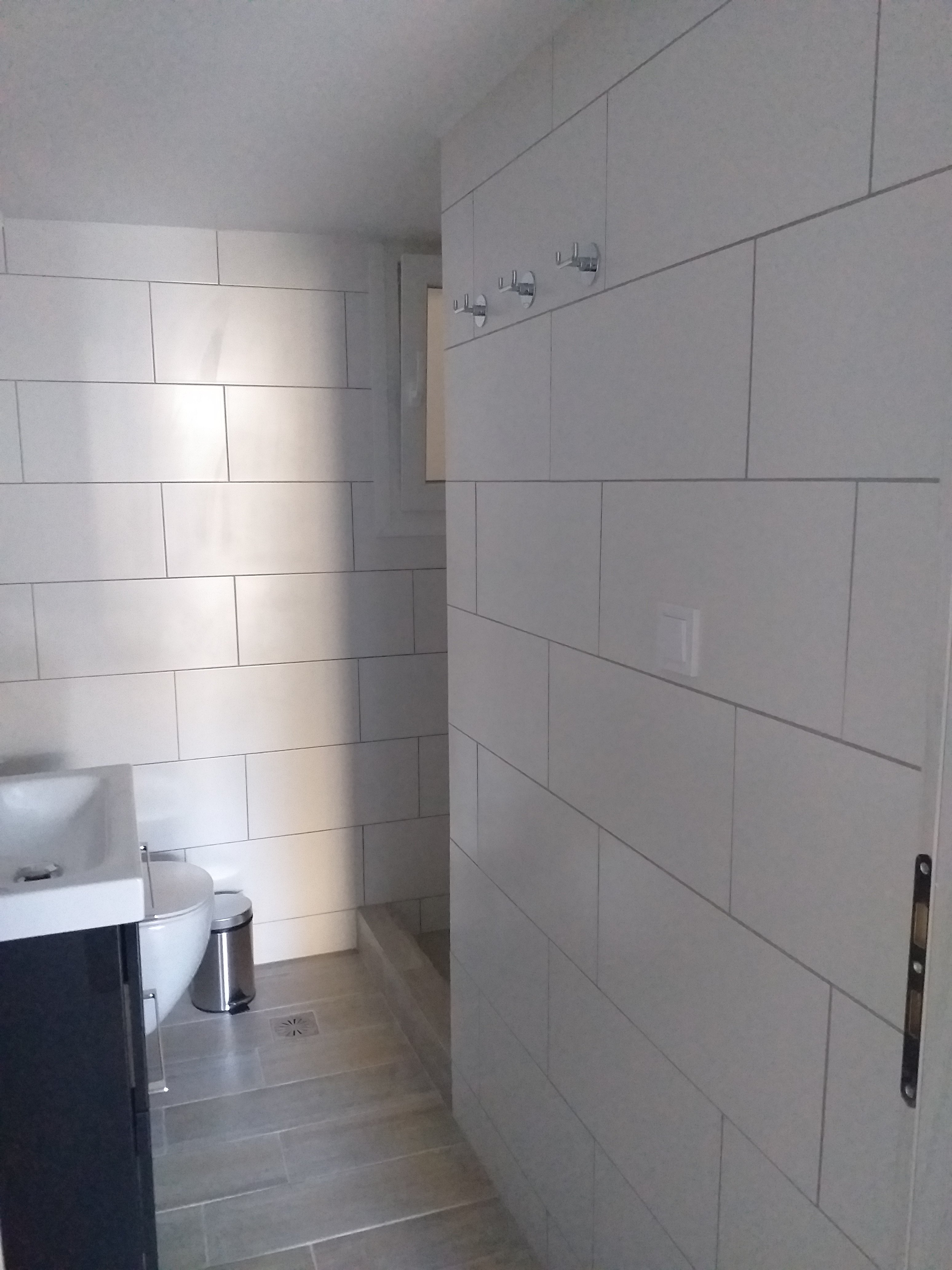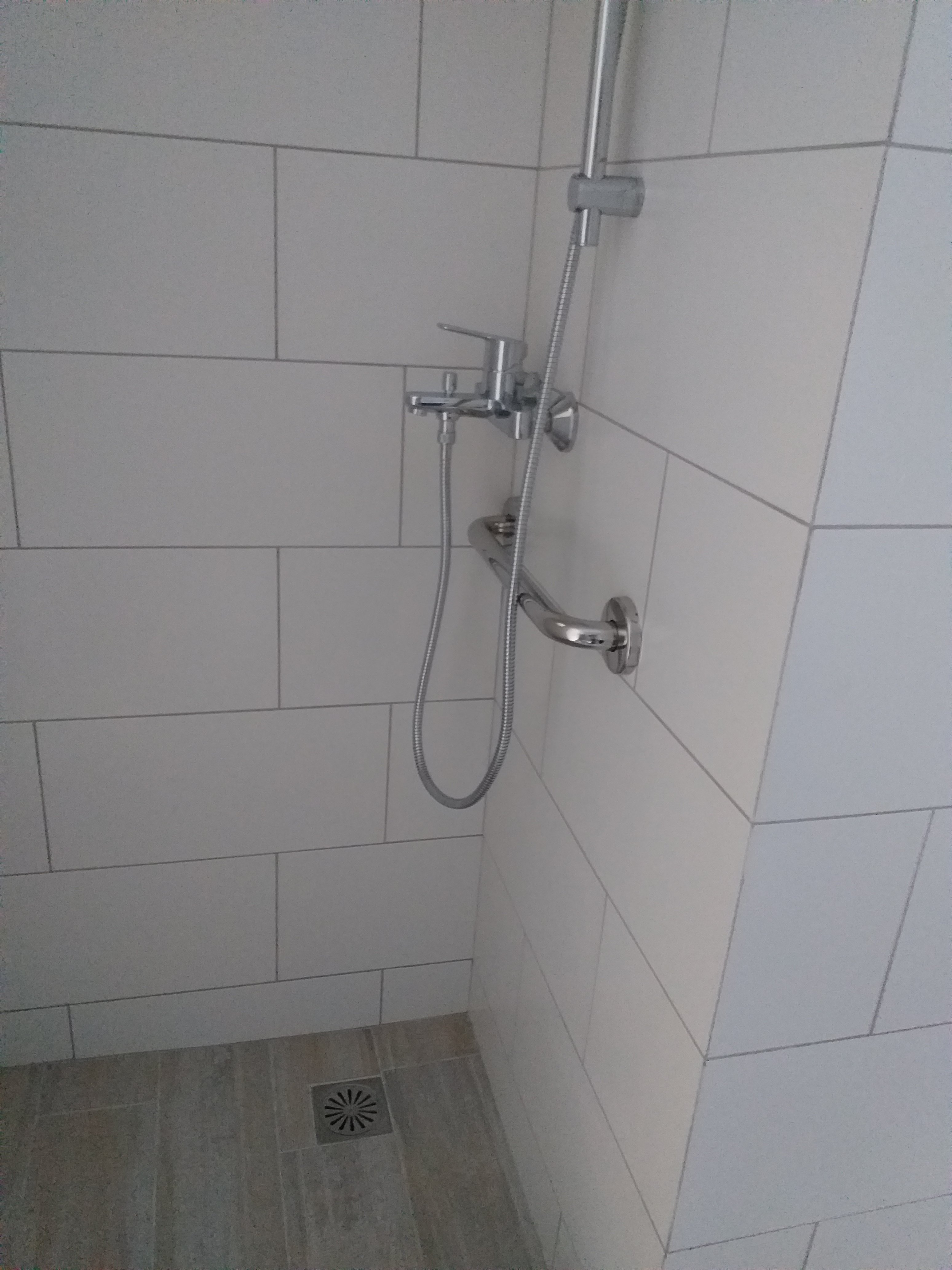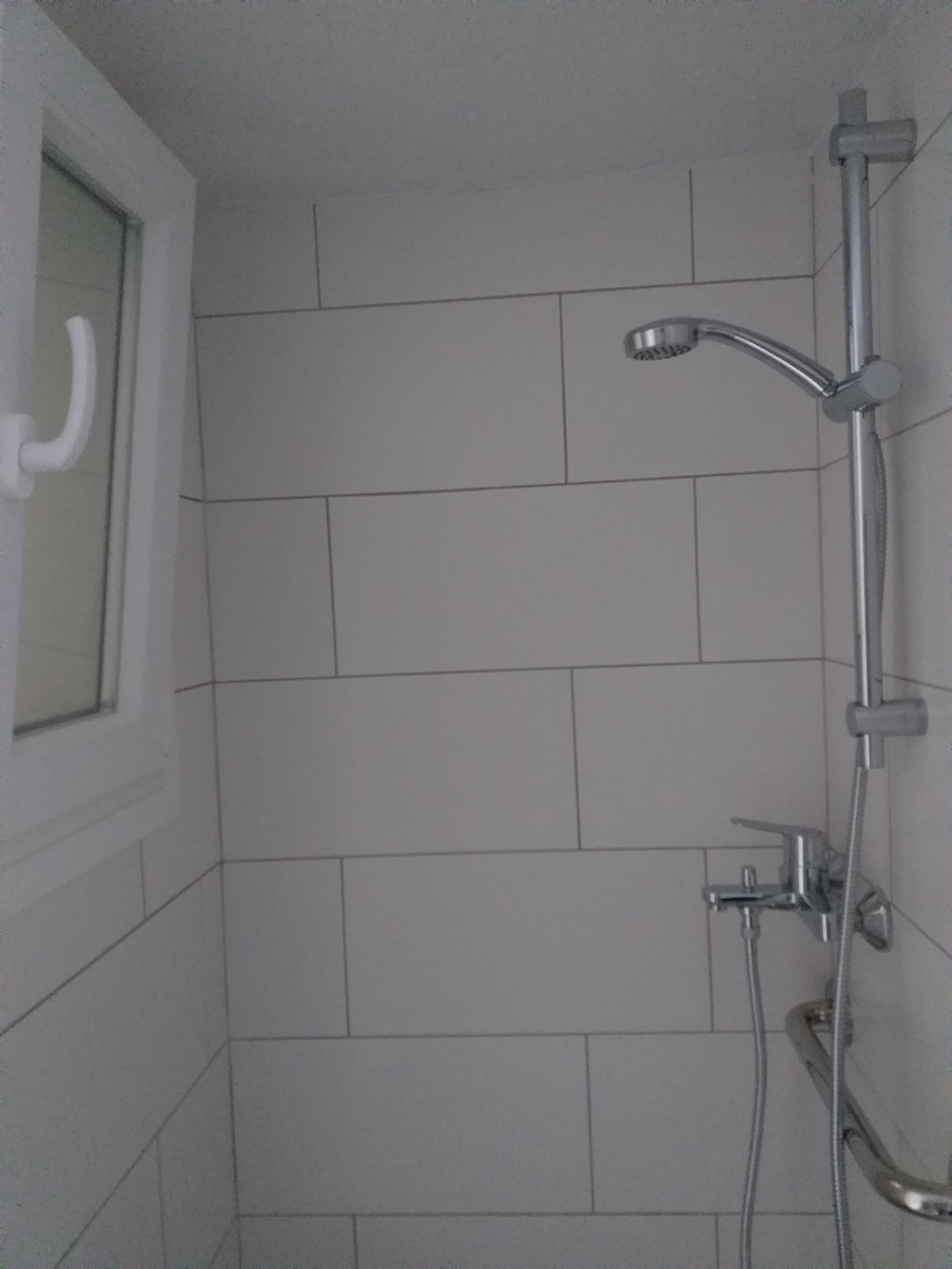 Stage 1. After removing SOME ivy. This is what it looked like from the gate to the renovated apartment looking toward the carport.Tossing ivy cuttings into the run-down little garden as I go.Stage 2: you can see into the carport now.Stage 3: light inside the dark and damp carport! Still tons of ivy to remove.The bathroom is finished!A bar for mom to hold onto.The smaller window. Greeks and windows in showers… I don’t know…The bathroom really is tiny. Still need to get and put up a shower curtain, but love the hooks for added hanging space.Kitchen finished. Dishwasher in place.
