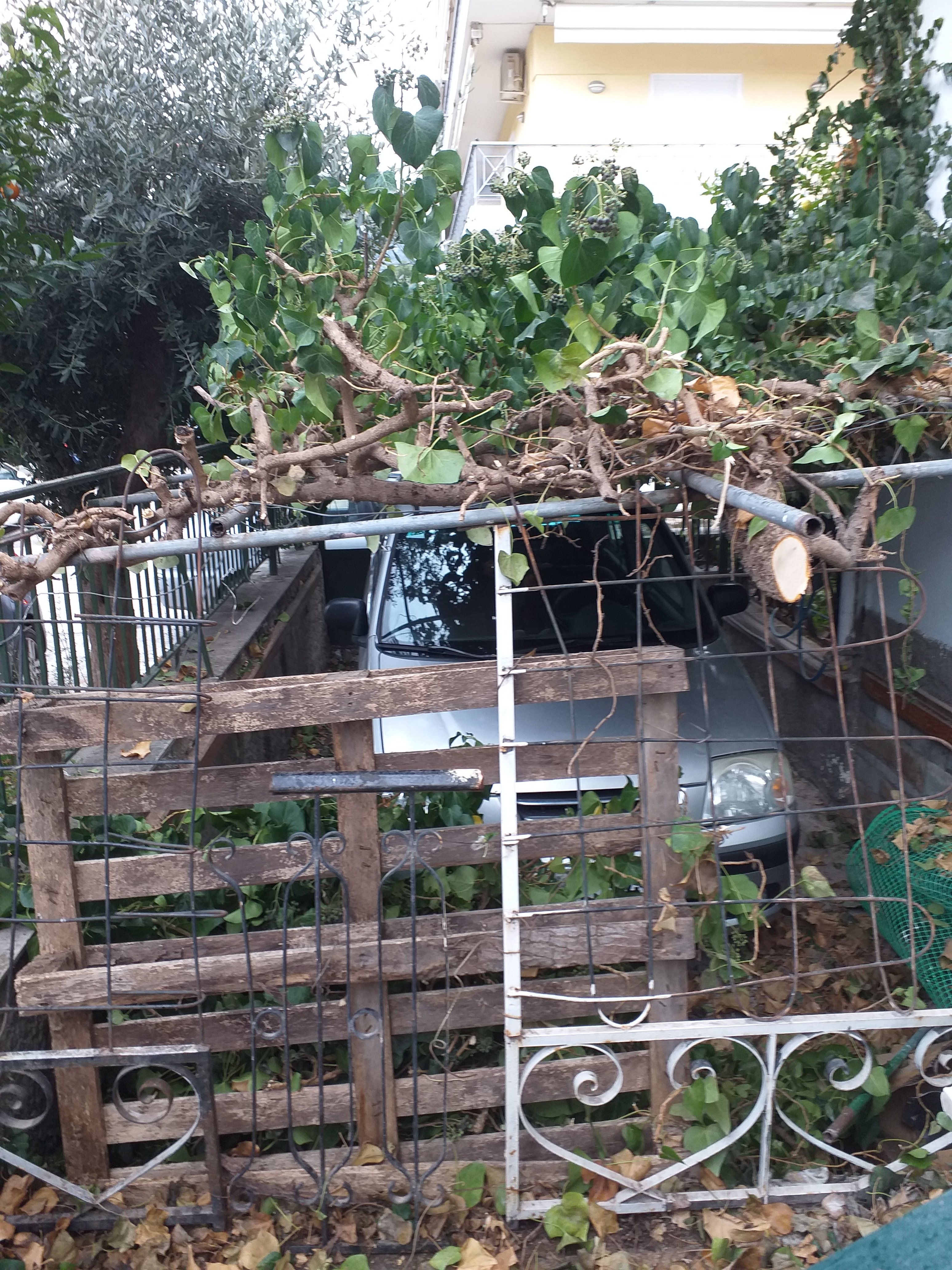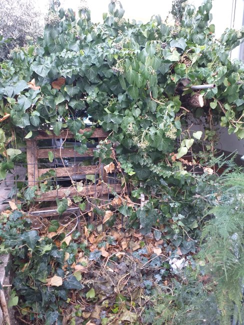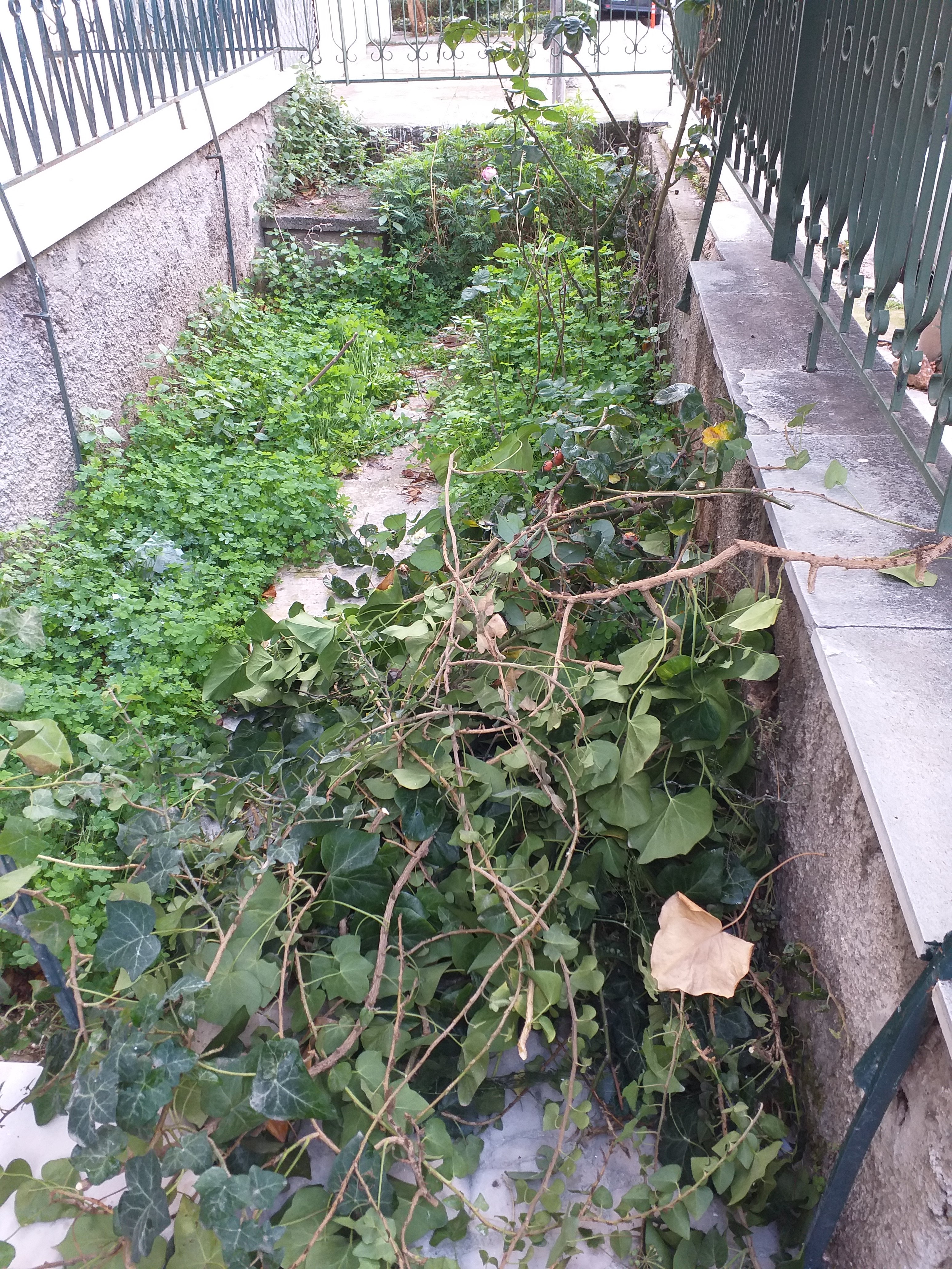 While fighting ivy, a gypsy drove by shouting out about taking away old metal things people don’t want so I called him over. We get that a lot here. Guys in trucks and utes go around neighbourhoods playing recordings saying they will clean out basements, rooftops, yards etc and take away anything you don’t want. Some will take furniture and just about any household items. Others will only collect metal. Sometimes they charge you for doing it, other times they will only take things which have resale value for them. The guy today took some old metal chairs I needed to get rid of, some old radiators, some odds and ends, plus the bags and boxes I’d already put on the staircase.