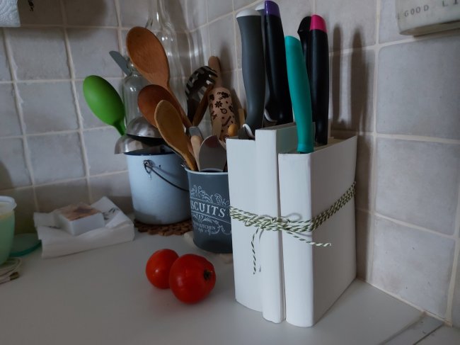 The usual: I simply chose the books I wanted to sacrific use, painted them with some offwhite chalk paint I had, tied them together with some twine I had, and voila. Instant knife block. Done. One small thing achieved in a mess of things to do.