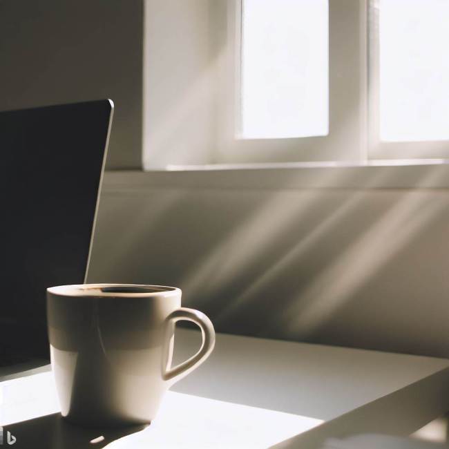 Would you believe this is an AI image? Microsoft Edge updated last night and this morning I was greeted with a message that I can now create images from words/descriptions. So I wrote coffee mug, laptop, sun coming in window. And this is what I got.