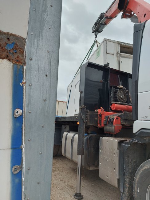 The crane on the back of the truck getting ready to tackle the container.Strapping it up to lift it off the back of the trailer.And lifting… and scraping, and struggling, and general pushing and shoving to get it across.