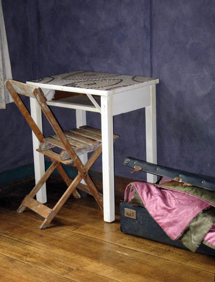 In the other corner is the mosaic topped old school desk which I use as my laptop table. An old suitcase holds extra blankets.
