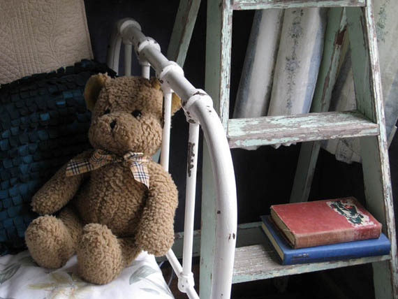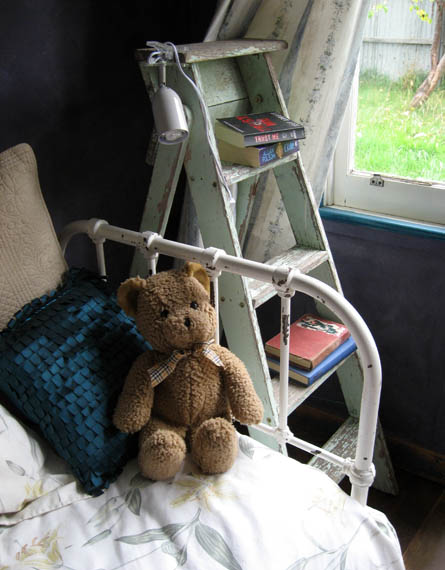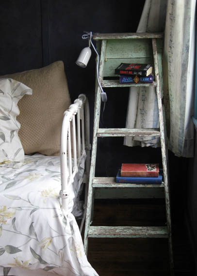 An old ladder acts as a bedside table. A small clip light works perfectly as a reading lamp.