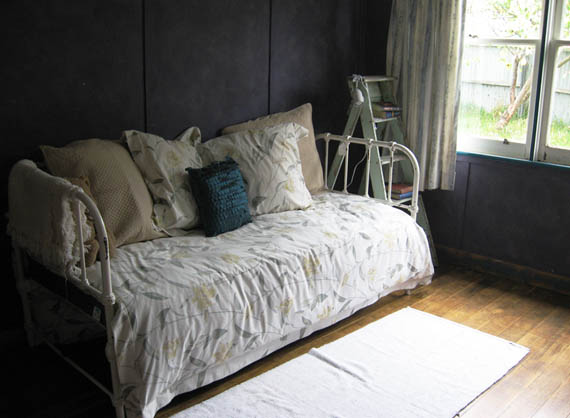 When I bought the house this room had a horrible carpet in it. I removed that and found some old lino, some old newspapers and a great timber floor! I used a hand sander to sand back any rough spots and then sealed it with polyurethane before moving my furniture in.