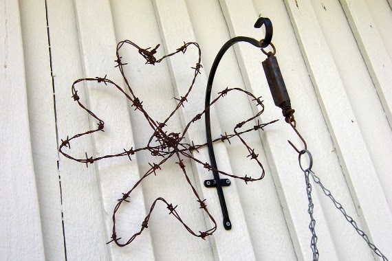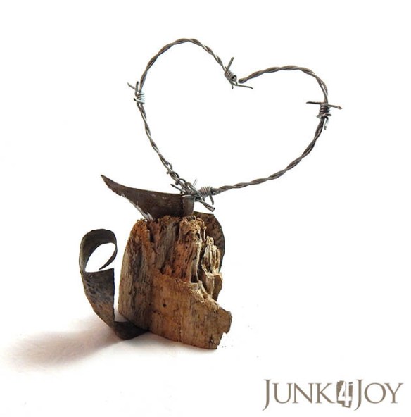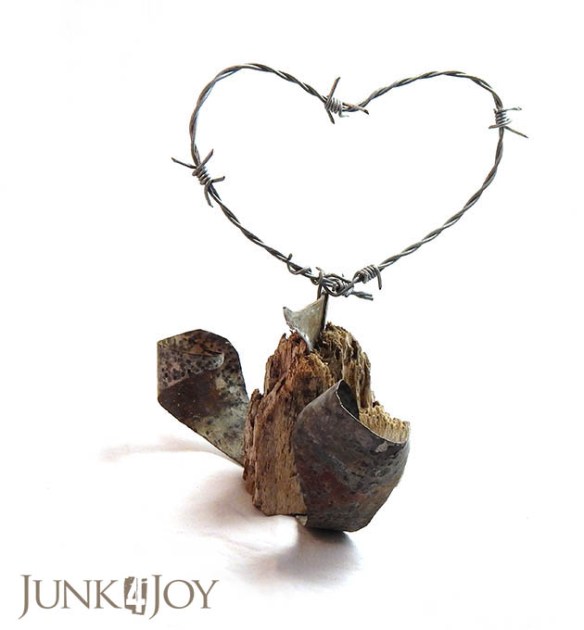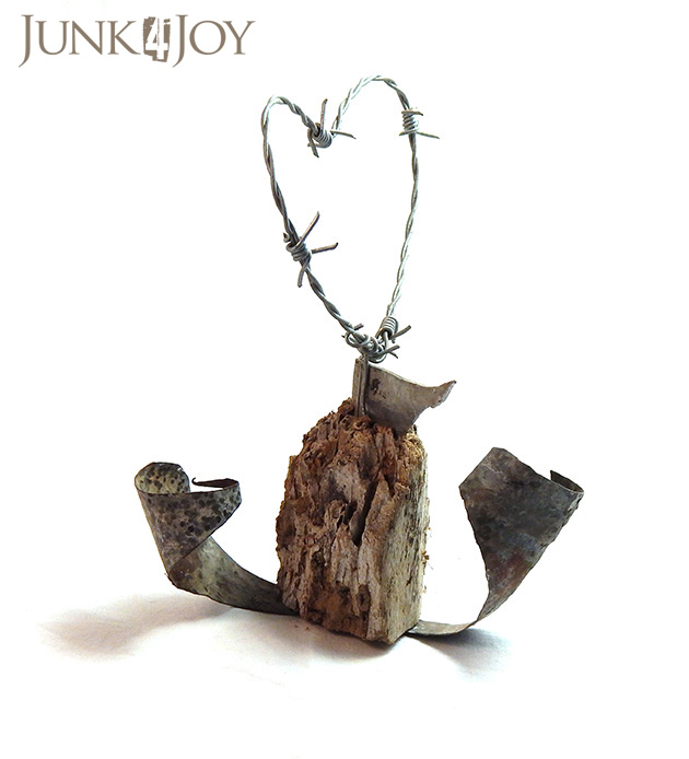 I can’t ever say Wayne doesn’t give me romantic gifts. He’s always making me hearts and flowers out of barbed wire. This is one of his creations, its about 8in tall and made of barbed wire, old roofing iron and a chunk of old wood.